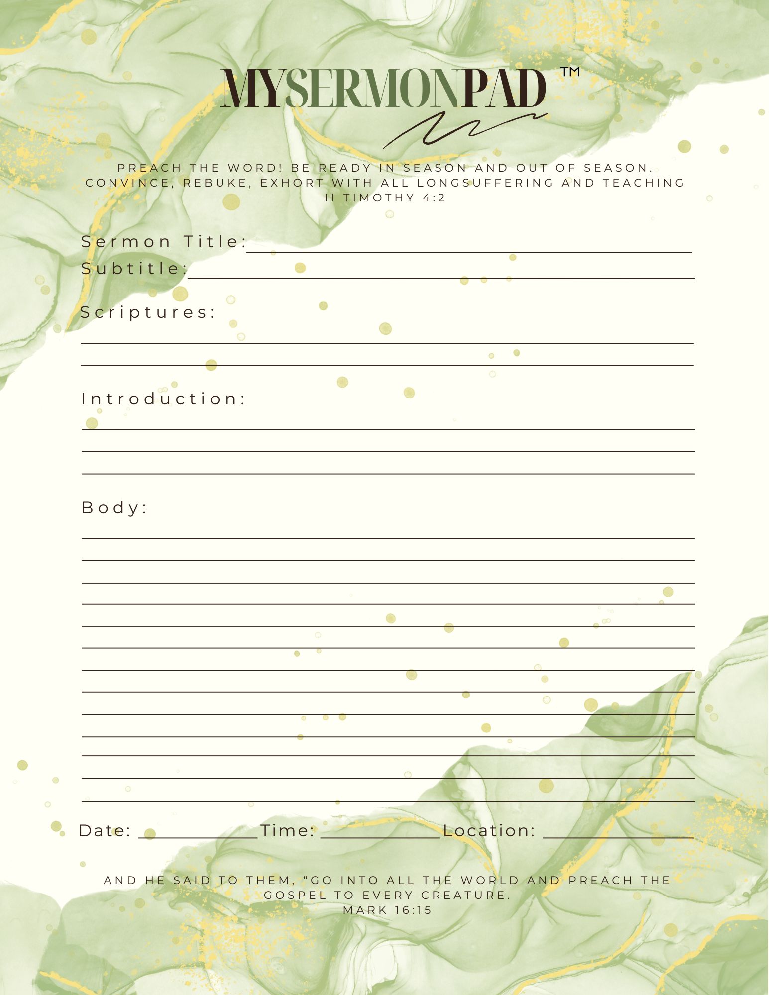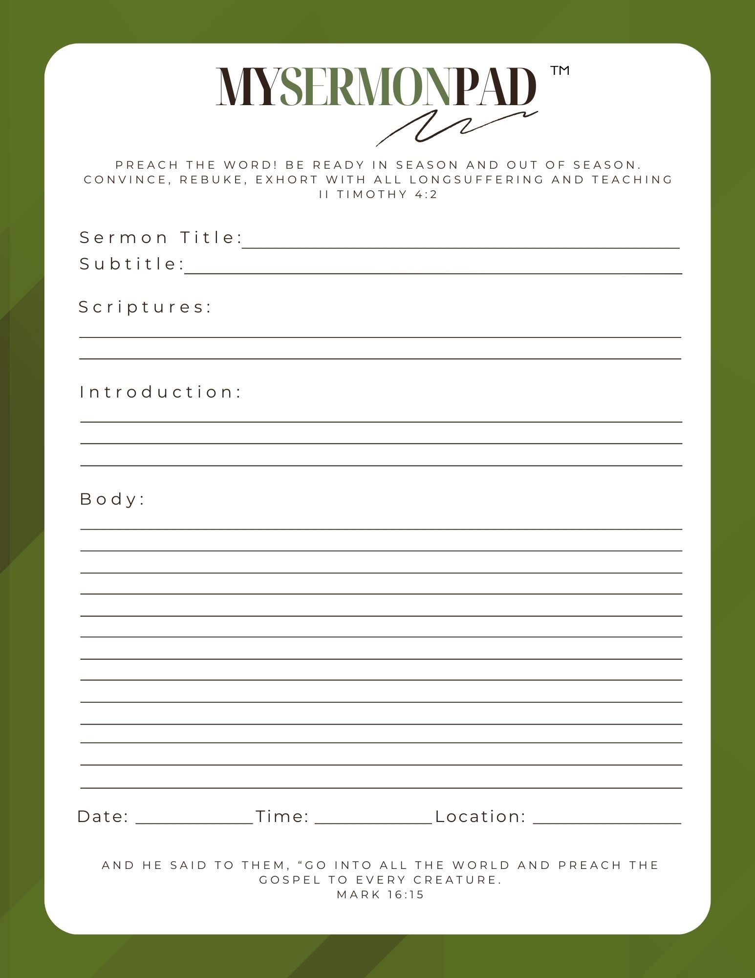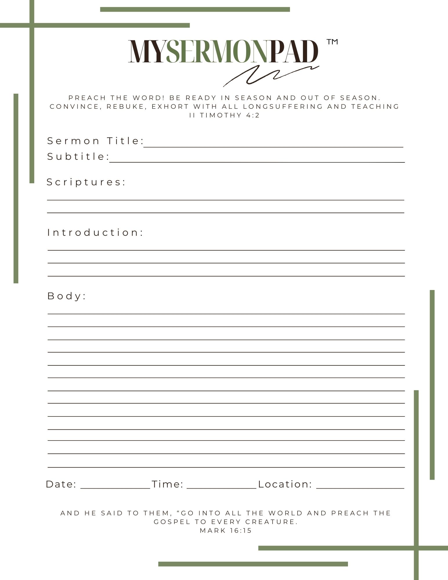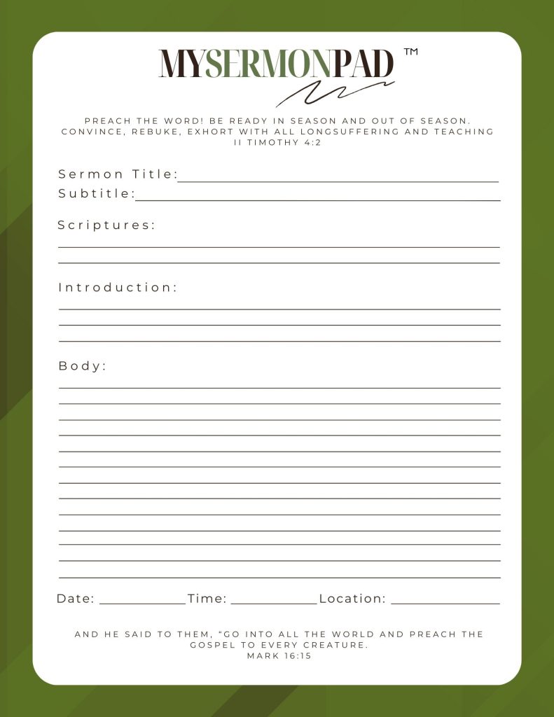 My Sermon Pad This pad is designed for you to write out your sermon in a simple outline form for quick reference or special highlights. Product# MSP1 Product# MSP2 Product# MSP3